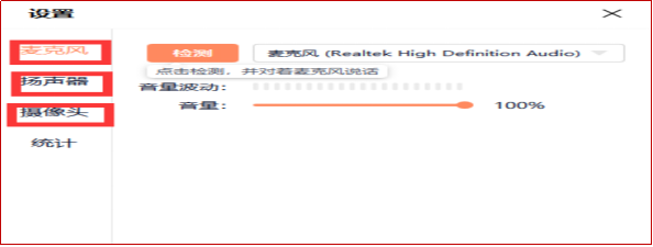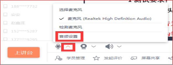 (1)操作:進入教室后點擊左下角麥樂風旁邊的下三角,“音頻設置”里即可進行設備檢測