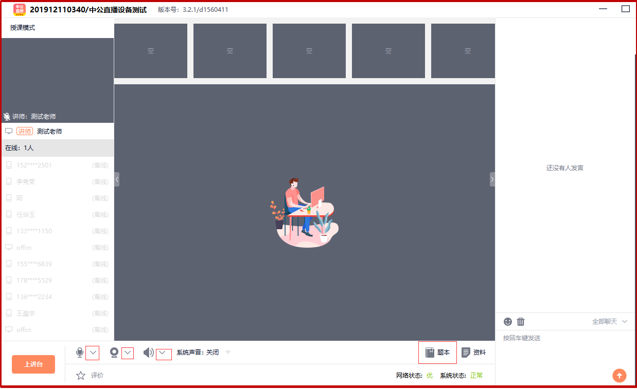- 登錄后,教室顯示為如圖形式,教室內(nèi)布局及功能詳解: