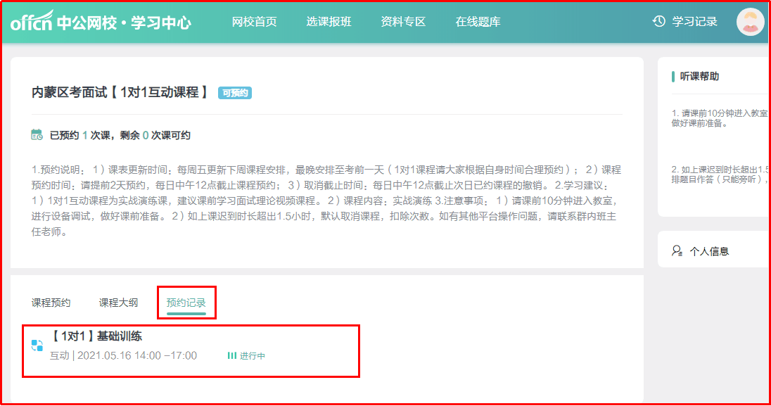 操作方法:登錄進入"互動課程首頁",從"預約記錄"中可以查看已經(jīng)上課的課程記錄,每次課程記錄中可以顯示參加的練習日志和下載本次課程的場外題目。