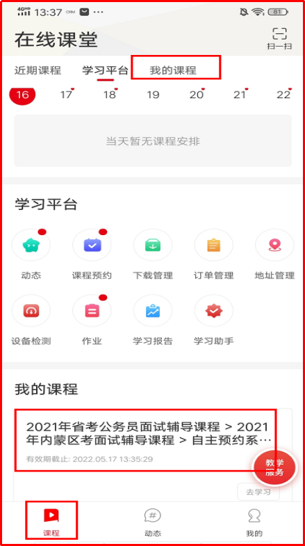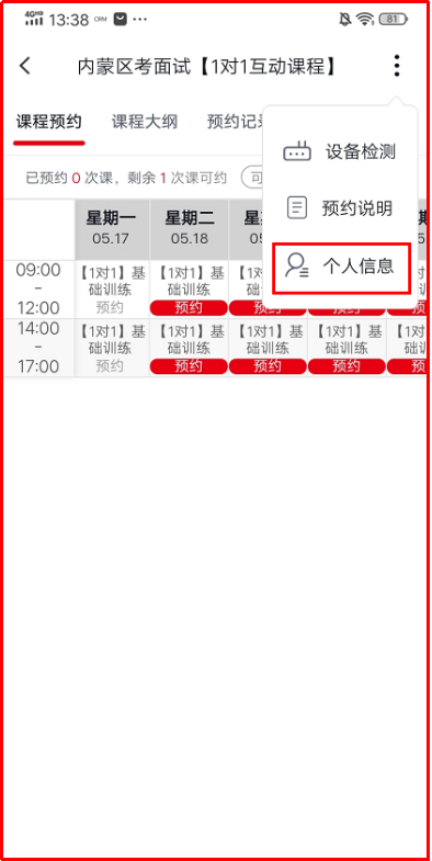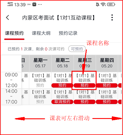 1.點(diǎn)擊“課程預(yù)約”可查看課表,并根據(jù)自己的時(shí)間預(yù)約上課