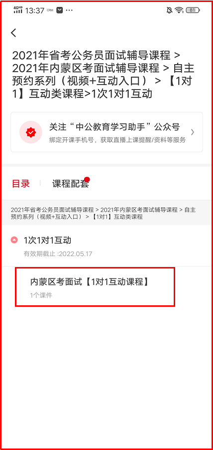 示例:以下以2021年省考公務(wù)員面試輔導(dǎo)課程 > 2021年內(nèi)蒙區(qū)考面試輔導(dǎo)課程 > 自主預(yù)約系列(視頻+互動(dòng)入口) > 【1對(duì)1】互動(dòng)類(lèi)課程為例。