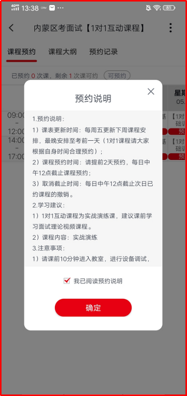 1.點(diǎn)擊“1對(duì)1互動(dòng)課程”進(jìn)入之后先進(jìn)行查看預(yù)約說(shuō)明,登錄互動(dòng)課程首頁(yè)后,在開(kāi)課狀態(tài)下的課程,在預(yù)約互動(dòng)課程時(shí)---會(huì)跳轉(zhuǎn)顯示預(yù)約說(shuō)明的頁(yè)面,請(qǐng)仔細(xì)閱讀并確認(rèn)。