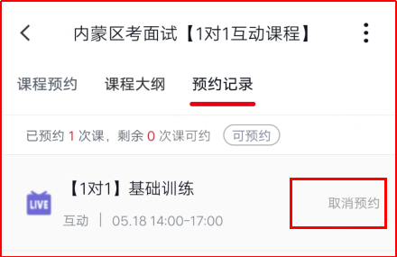 (1)面試1對(duì)1互動(dòng)課程,每天中午12點(diǎn)截止次日課程的預(yù)約,如若更改預(yù)約時(shí)間或臨時(shí)有事需要取消課程,需要在開(kāi)課前1天中午12點(diǎn)之前點(diǎn)擊預(yù)約記錄--點(diǎn)擊“取消預(yù)約”;