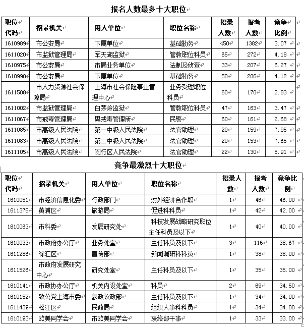 來自市公安局的下屬單位基礎(chǔ)勤務(wù)一職雖然招來一千多人為其折腰,但并不是競爭最激烈的職位,到報名截止時,市經(jīng)濟信息化委行政部門對外經(jīng)濟合作職以46:1的競爭比位居榜首,成為2016上海公務(wù)員考試首輪職位報名最“傲嬌”的職位,其中,黃浦區(qū)旅游局促進科科員一職以及市科委發(fā)展研究處的科員職位競爭比例均在40:1以上,考生們想要真正“拿下”則需要付出更多努力。