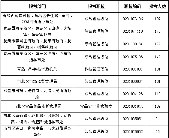 報名第一日青島市所屬的職位中,報名人數(shù)前三位的職位依次是:青島西海岸新區(qū)、黃島區(qū)長江路、黃島、薛家島街道辦事處(不限專業(yè))、青島西海岸新區(qū)、黃島區(qū)寶山鎮(zhèn)、大場鎮(zhèn)、海青鎮(zhèn)政府(不限專業(yè))、膠州市李哥莊鎮(zhèn)政府、膠萊鎮(zhèn)政府、膠西鎮(zhèn)政府、鋪集鎮(zhèn)政府(不限專業(yè)),報名人數(shù)分別為197、175、172,報錄比分別為:66:1;58:1;29:1