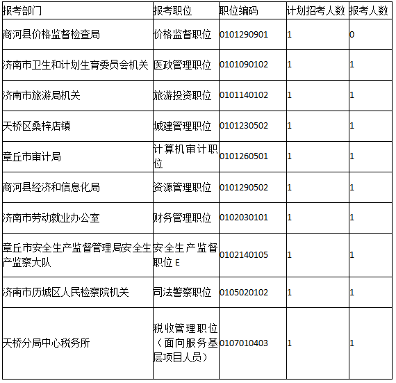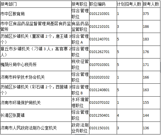 2016年濟(jì)南市所屬的職位中,報(bào)名人數(shù)前三位的職位依次是:市中區(qū)教育局綜合管理職位、市中區(qū)食品藥品監(jiān)督管理局基層食藥監(jiān)管所食品藥品監(jiān)管職位、歷城區(qū)鄉(xiāng)鎮(zhèn)機(jī)關(guān)(董家鎮(zhèn)2個(gè),唐王鎮(zhèn)3個(gè))綜合管理職位A,競(jìng)爭(zhēng)比例依次是:375:1、62:1、183:5。