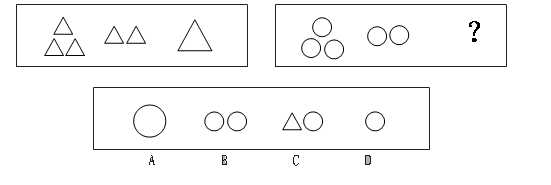 解析:答案為A。第一套圖形是三角形由三個(gè)遞減為一個(gè),第二套圖形是圓形由三個(gè)減為兩個(gè),最后一個(gè)是要填的圖形。很顯然,這兩套圖形排列的共同規(guī)律是圖形每下一個(gè)遞減一個(gè)。所以問號處應(yīng)填上一個(gè)圓。選項(xiàng)中A和D都是圓,那么究竟該選哪一個(gè)呢?再看第一套圖形,最后一個(gè)三角形明顯比前面的三角形大。所以問號處也應(yīng)是一個(gè)大圓。實(shí)際上這道題的排列用了兩種規(guī)律,若粗心大意,往往會認(rèn)為D是正確答案,而漏掉了真正的正確答案A。