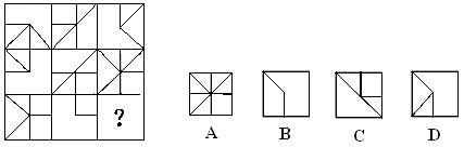 (解答:每行前兩個(gè)圖形疊加后,不同的部分就是第三個(gè)圖形。正確答案是D。)