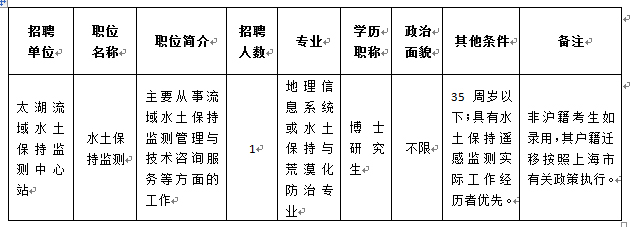 太湖流域水土保持監(jiān)測(cè)中心站公開(kāi)招聘工作人員1名,招聘職位要求詳見(jiàn)下表。