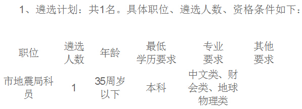 1、遴選計(jì)劃:共1名。具體職位、遴選人數(shù)、資格條件如下: