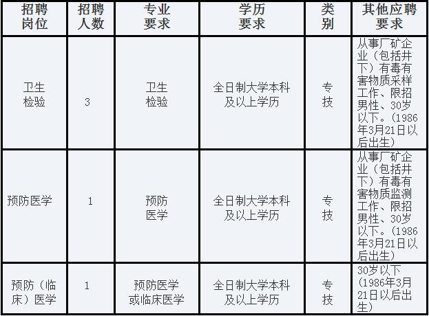 衛(wèi)生檢驗崗位3個、預(yù)防(臨床)醫(yī)學(xué)崗位1個、預(yù)防醫(yī)學(xué)崗位1個。