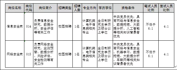 校園招聘2名,其中信息安全崗人員1名,網(wǎng)絡(luò)安全崗人員1名。