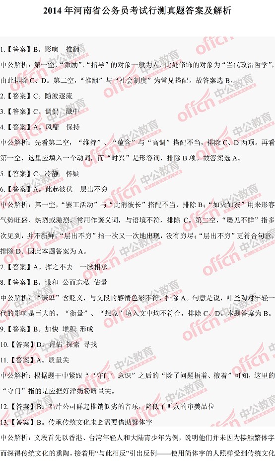 2014年河南公務(wù)員考試結(jié)束后,中公網(wǎng)校會第一時間發(fā)布河南公務(wù)員行測 解析,考生還可關(guān)注2014年河南公務(wù)員筆試 匯總專題。